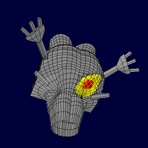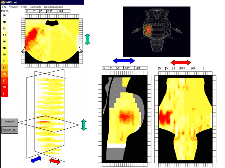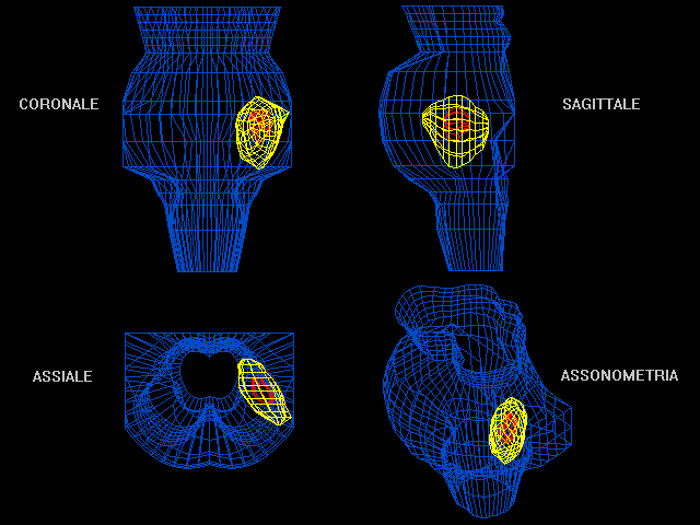 Da questi dati il programma ricostruisce una lesione mappandola su un modello di troncoencefalo ideale suddiviso in 5268 microvolumi elementari (“voxels”) da 2x2x2 mm a 2x2x4 mm. La mappatura consiste nell’assegnare a ciascun voxel un’appropriata probabilità, rappresentata in codice-colore, di essere coinvolto dalla lesione. Ne risulta una ricostruzione tridimensionale, in falsi colori, della lesione probabile, che il programma può poi ulteriormente elaborare matematicamente (filtraggi, windowing, arrotondamenti, ecc.), ruotare, mostrare da ogni punto di vista, o esportare verso programmi di computer-grafica come 3D-Studio a fini didascalici. Naturalmente, possono anche essere estratte sezioni bidimensionali assiali, sagittali e coronali da esaminare come le comuni sezioni nuroradiologiche.