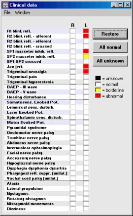 I dati clinici (sintomi e segni rilevati all’esame neurologico) e neurofisiologici (riflessi trigeminali e potenziali evocati acustici, motori e somatosensoriali) vengono forniti dall’utente al programma tramite una scheda di 72 item (23 dati clinici e 13 dati neurofisiologici per ciascuno dei due lati del corpo), a ognuno dei quali l’utente assegna un valore normale, dubbio, patologico, o non esaminato.