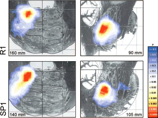 Riflessi R1 e SP1 in sezione pontina assiale (a sinistra) e sagittale (a destra). Ambedue questi riflessi risultano avere i loro voxel più significativi nel ponte intermedio dorsale, vicino al pavimento del IV ventricolo e al nucleo sensitivo trigeminale principale, con scarse differenze tra i due. Sebbene i voxel più significativi di R1 appaiano lievemente più mediali e caudali di quelli di SP1, una successiva verifica su 13 pazienti con R1 alterato e SP1 normale, e 23 pazienti con R1 normale e SP1 alterato, ha rivelato che tale differenza non è significativa.