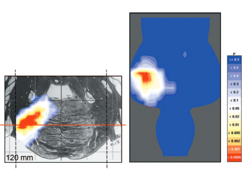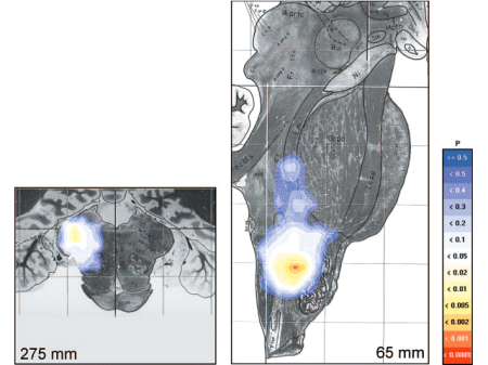 Il valore medio di lesione di ciascun voxel così ottenuto (somma del valore nei singoli pazienti, divisa per il numero di pazienti) viene confrontato statisticamente con il valore medio di quel medesimo voxel in un gruppo di controllo (test a due campioni), oppure con la media di tutti i voxel di tutti i pazienti del gruppo patologico, media che rappresenta la probabilità generica di un voxel qualsiasi di essere sede di lesione nel gruppo patologico (test a un campione). In ambedue i casi l’immagine di lesione restituita dal programma, ancora distribuita in codice-colore nel modello ideale 3D di troncoencefalo, rappresenta la distribuzione topografica delle significatività statistiche riscontrate, consentendo così di identificare i punti di massima associazione statistica tra lesione neuroradiologica e segno funzionale. Quelli saranno i punti maggiormente responsabili ai fini della funzione neurofisiologica studiata.