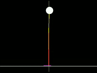 Rispetto al modello del braccio questa rete ha un unico compito motorio: la “volontà” si limita, infatti, a richiedere costantemente soltanto che la testa sia mantenuta più alta possibile (lo sperimentatore ha comunque la possibilità di aggiungere uno o due compiti accessori che descriveremo fra poco). Ma la fisica e il sistema sensoriale che la rete si trova a dover gestire sono ora più complessi.
