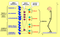 Il sistema sensoriale, oltre alle informazioni visive e a quelle propriocettive delle articolazioni come nel modello braccio, comprende anche informazioni propriocettive dalla pianta dei piedi (posizione della proiezione verticale del baricentro sulla base di appoggio) e informazioni vestibolari sull’inclinazione assoluta della testa (direzione del vettore gravità rispetto all’asse verticale della testa) e sulla sua accelerazione.