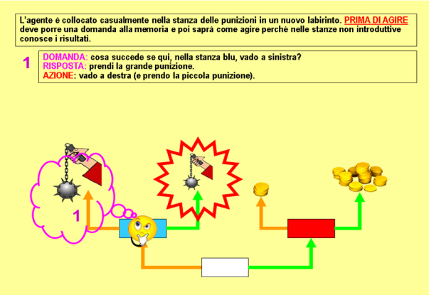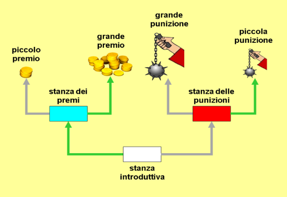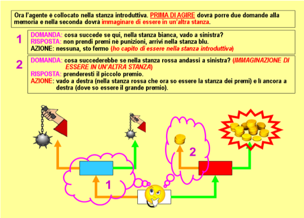 Se l'agente si trova già in una stanza dei premi o delle punizioni la memoria associativa restituisce una risposta precisa di premio o punizione e della sua entità, ad es. “prenderai la grande punizione”, sulla quale la rete direttiva è in grado di produrre l'azione adatta (nel caso dell'esempio prendere la porta opposta, che fa conseguire la piccola punizione) (Fig. 87).