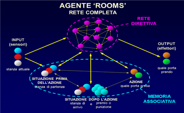 Ogni agente può percepire il ‘colore’ della stanza in cui si trova, ma non sa se quella sia la stanza introduttiva o quella dei premi o quella delle punizioni, fino a quando la sua memoria non rievoca il ricordo del risultato di una porta di quella stanza. La rete direttiva può anche indurre la memoria a rievocare il ricordo di una stanza diversa da quella in cui l’agente si trova, capacità che vedremo essere molto importante.
