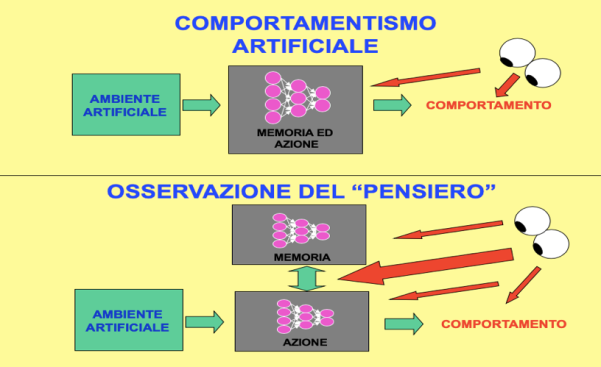 L'apprendimento genetico è in grado di cogliere solo le caratteristiche ambientali costanti, ma l'ambiente progettato non conteneva caratteristiche costanti, dal momento che i 24 labirinti erano tutti diversi nelle loro caratteristiche. Ci attendevamo quindi che l’evoluzione scovasse l’unica costante possibile, una strategia di comportamento valida per tutti i labirinti, cosa che i risultati hanno confermato. La nostra tesi che un sistema di questo tipo utilizzi l’interazione di una componente direttiva con una componente di memoria, in cui la componente direttiva induce opportune rievocazioni dalla componente di memoria e le utilizza per decidere il comportamento, appare confermato dalla ‘lettura della mente’ del migliore agente, e dal fallimento della popolazione di controllo in cui tale interazione era impedita.