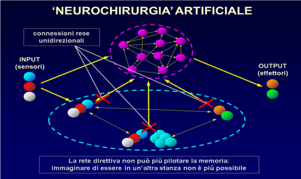 Fig. 84. ‘Lobectomia artificiale’. Le ‘X’ rosse indicano le connessioni interrotte. La rete a tripletta è innescata solo dall’input sensoriale, per cui può rievocare solo ricordi riguardanti la stanza in cui l’agente effettivamente si trova. L’immaginazione è abolita.