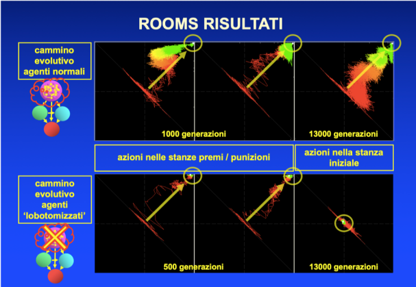 Il conseguimento della capacità di attuare azioni corrette nelle stanze dei premi e delle punizioniagire anche da parte della popolazione di controllo è particolarmente interessante. Sebbene nelle popolazioni simulate avessimo reso impossibile lo sviluppo di riflessi propriamente detti, ossia di azioni comandate direttamente dalla memoria associativa senza l’intervento della rete direttiva, nella popolazione di controllo era abolita la possibilità per la rete direttiva di comandare la memoria, ma non la possibilità per la memoria di dare alla rete direttiva informazioni sulla situazione reale-attuale. Anche se non riceveva connessioni dalla rete direttiva la memoria riceveva ancora, direttamente dalle unità di input alle sue unità ‘situazione prima dell’azione’ (Figg. 82, 84), informazione circa la stanza reale-attuale in cui l’agente si trovava (il colore della stanza), e poteva quindi rievocare ricordi relativi a quella stanza (mentre non poteva rievocare ricordi relativi ad un’altra stanza, ossia immaginare). Poiché le connessioni dalla memoria alla rete direttiva, diversamente da quelle in verso opposto, erano risparmiate, la rete direttiva poteva ‘leggere’ quei ricordi, e nelle stanze del premio o della punizione tali ricordi sono sufficienti per attuare l’azione corretta. In quelle stanze la rete direttiva non è necessaria, se non per invertire l'azione nei casi in cui la memoria rievoca un'azione con risultato sfavorevole, ad es. per prendere la porta di destra quando la memoria informa che quella di sinistra dà piccolo premio o grande punizione. Invece nella stanza introduttiva la memoria, per poter rievocare un premio o una punizione, deve essere attivata con il colore di un'altra stanza, vale a dire con una sensorialità immaginata, l'immaginazione di essere in un'altra stanza; attivazione che solo la rete direttiva può generare. Questo spiega il successo della popolazione ‘lobectomizzata’ nelle stanze del premio e della punizione, e solo in quelle. A conferma di ciò vi è anche il fatto che in questa popolazione l’evoluzione ha prodotto una rete direttiva di sole 3 unità, evidentemente sufficienti a confermare o invertire l’azione rievocata dalla memoria. Tutto questo conferma che senza l’apporto 'immaginativo' della rete direttiva il sistema è in grado di sviluppare solo un 'pensiero concreto' (ricordi pertinenti solo al contesto, previsioni confinate alla situazione reale attuale), e lo fa anche molto rapidamente; ma non è in grado di formulare previsioni relative a situazioni diverse e immaginarie, che invece fa efficacemente quando è presente una rete direttiva. Questo potrebbe anche costituire un modello per il pensiero concreto o ‘concretismo’ presente in alcune psicopatologie umane, quali le condizioni di oligofrenia o demenza lieve o moderata.