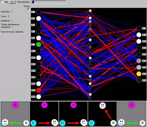 Sinteticamente, una popolazione di 100 reti neurali ‘agenti’ viene fatta agire in un ambiente in cui per produrre comportamenti utili è vantaggioso ricordare le esperienze passate e prevedere i risultati delle azioni future. Ogni rete neurale è costituita da due componenti: una memoria associativa, che conosce (ricorda) l'ambiente, ma non può agire; ed una rete ‘direttiva’, che può evocare ricordi dalla memoria ed agire, sfruttando quei ricordi per ‘scegliere’ le azioni adatte. La memoria è precostituita, perfetta, uguale per tutti gli agenti e invariabile nel tempo. Le reti direttive sono inizialmente casuali, diverse fra tutti gli agenti, e sono fatte evolvere con algoritmo genetico che modifica il numero e le caratteristiche delle loro unità e connessioni, sia ‘interne’ che con la memoria, verso la massimizzazione della fitness.