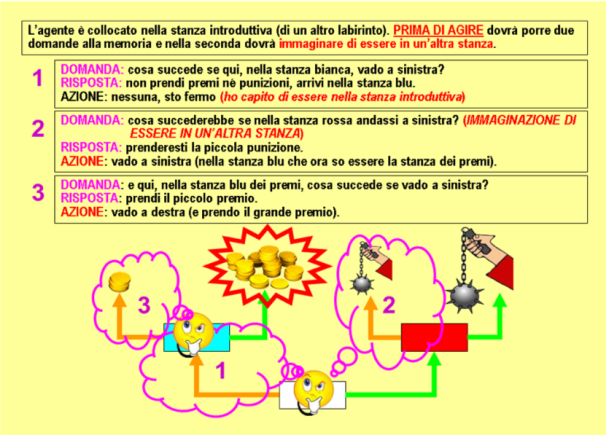 Con questa strategia gli agenti, quando sono nelle stanze premi o punizioni, possono risolvere qualsiasi labirinto in un solo turno; in due turni quando partono invece dalla stanza introduttiva e la stanza dei premi è a destra; in tre turni quando partono dalla stanza introduttiva e la stanza dei premi è a sinistra. La simulazione ha quindi sviluppato evolutivamente una strategia che consente ad ogni agente, con una sequenza standard di domande alla propria memoria, di ottenere il risultato ottimale in tutti i labirinti, in qualunque stanza venga casualmente collocato alla partenza. È comparsa la capacità d'immaginare il risultato di una scelta comportamentale in una stanza futura e l’immaginazione è il presupposto per il pensiero.